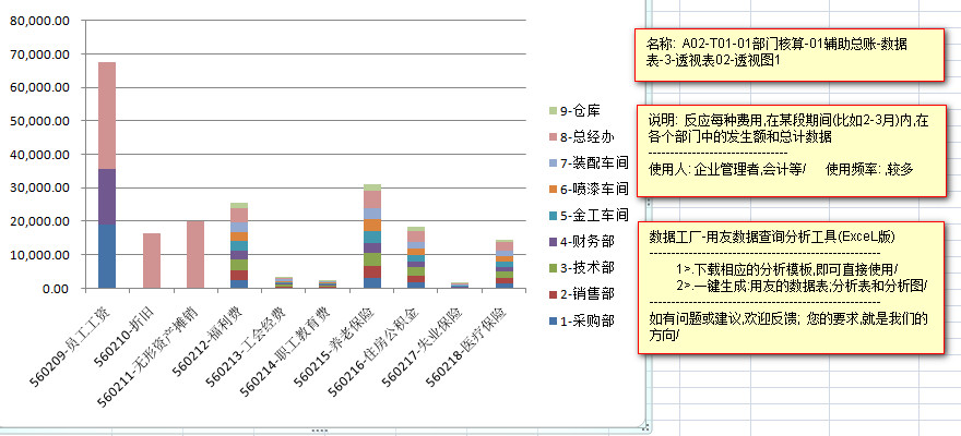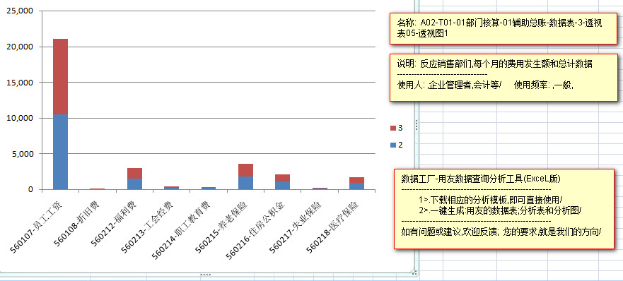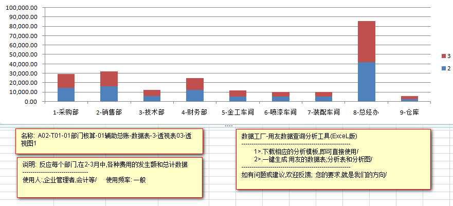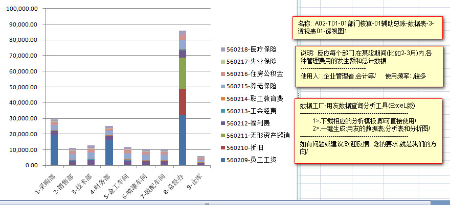 ---------以柱状图的形式,每一种费用,在每个部门的发生金额,和每种费用的合计金额