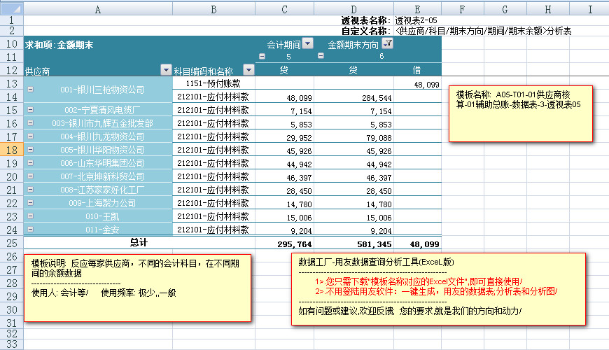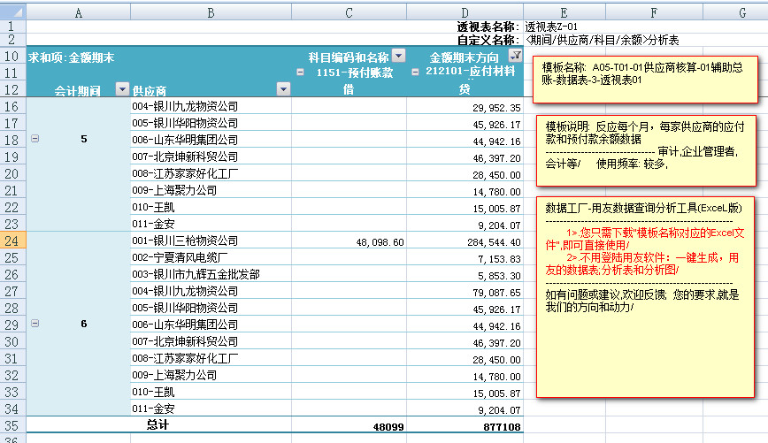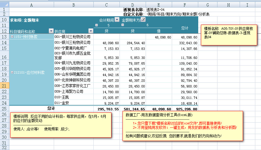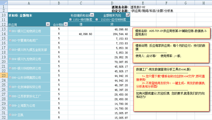 模板文件的名称: < A05-T01-01供应商核算-辅助总账-数据表>