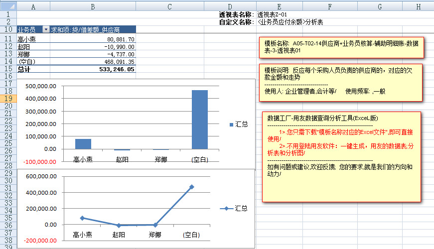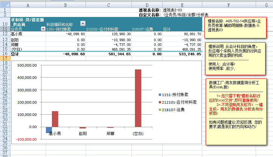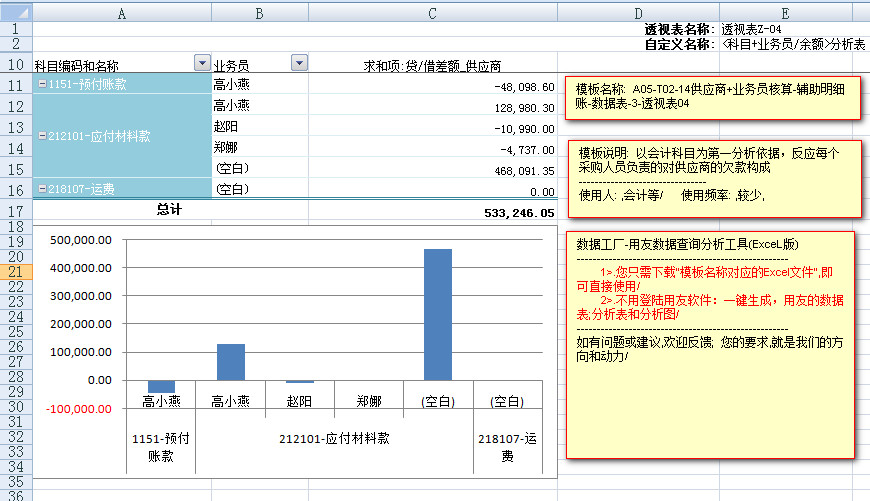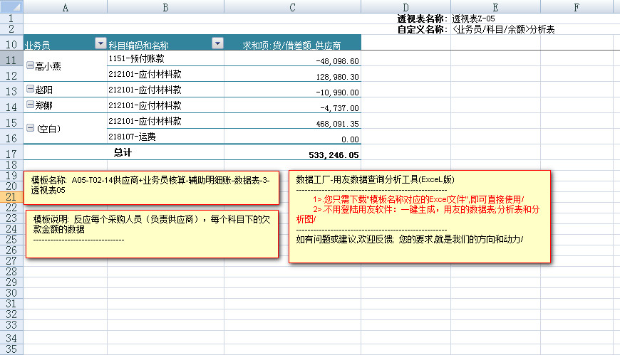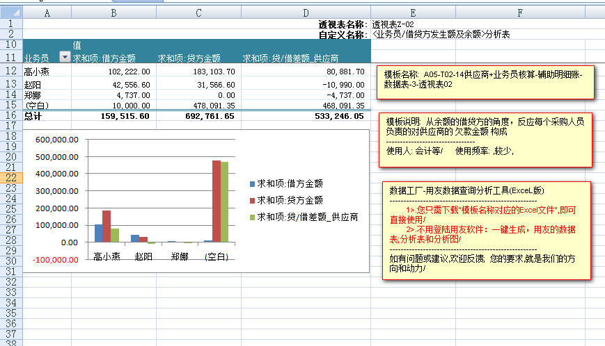 模板文件的名称: < A05-T02-14供应商+业务员核算-辅助明细账-数据表>