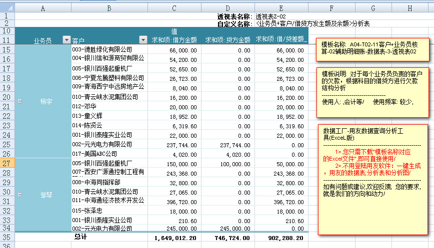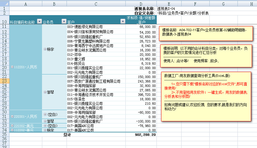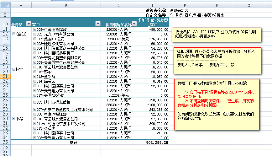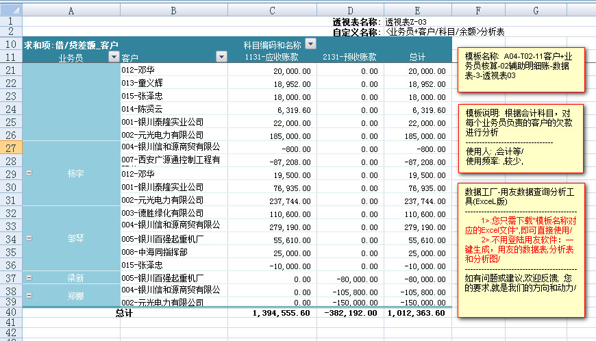 ---------从会计科目名称的角度,分析,每个会计科目下,每个业务员负责的相关客户的往来余额数据