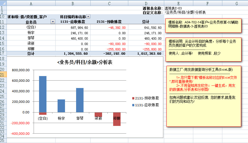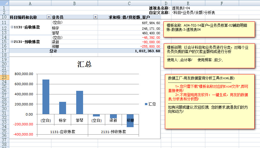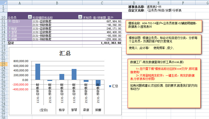 ---------从会计科目名称的角度,分析,每个会计科目下,每个业务员负责的客户的往来余额数据