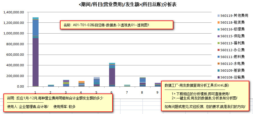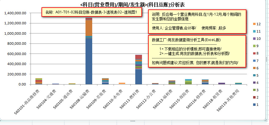---------以柱状图的形式,反应1-12月中,每个月的,每种营业费用的发生额和每月营业费用总金额的数据信息