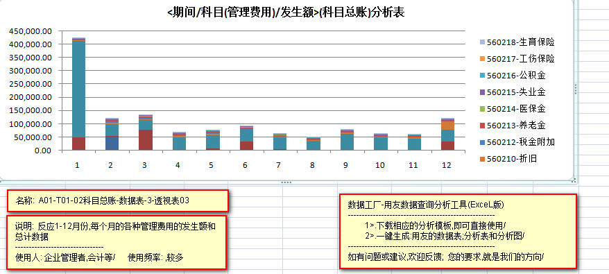 ---------以柱状图的形式,反应每种管理费用,在1-12月中,每个月的的发生额,和具体管理费用总金额的数据信息