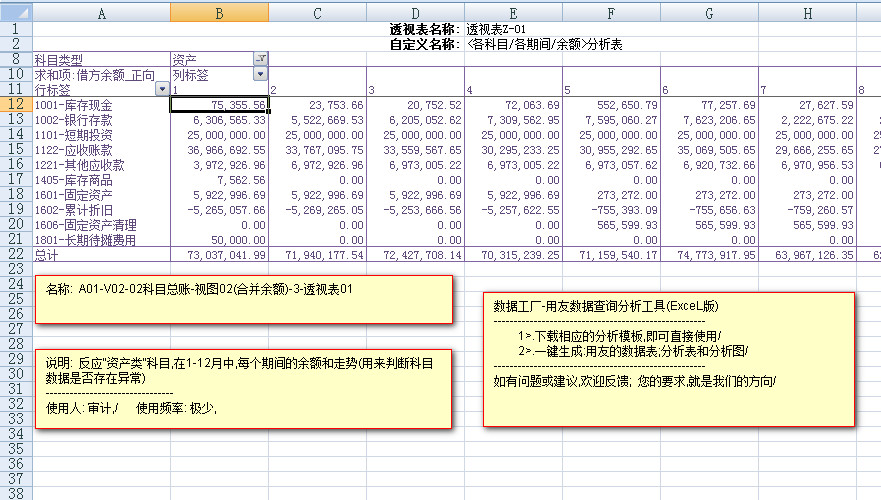 ---------反应,每个资产类科目,在1-12月中,每个月余额数据