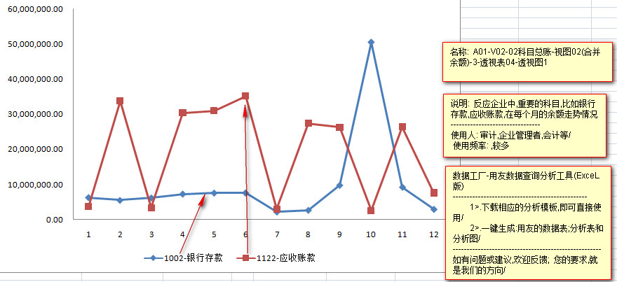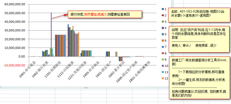 ---------银行存款科目,在1月到9月的余额数据,变动比较平缓,但是在10月急剧增加,但是在12月有快速下降,这里就需要进行原因的检查