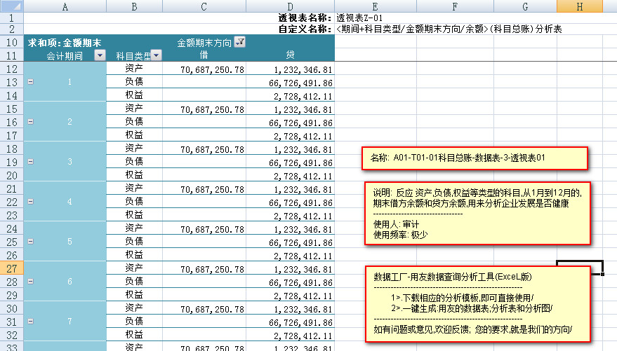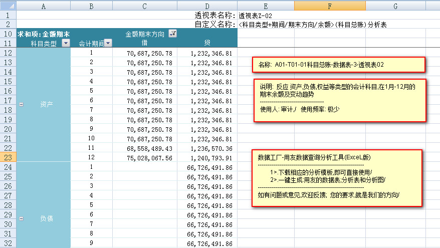 ---------根据,各期间,各类型(资产,负债,权益等)的科目余额和走势用来从宏观判断企业的发展是否健康,是否存在异常,一般在审计,或者企业进行融资,或者对企业进行查账时使用