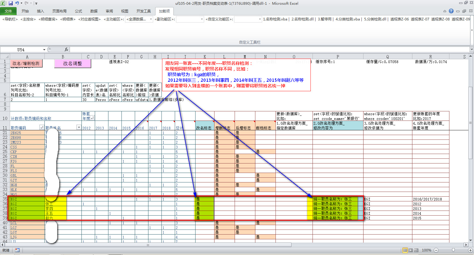 如果需要导入金蝶的一个账套中,则需要统一掉职员名称