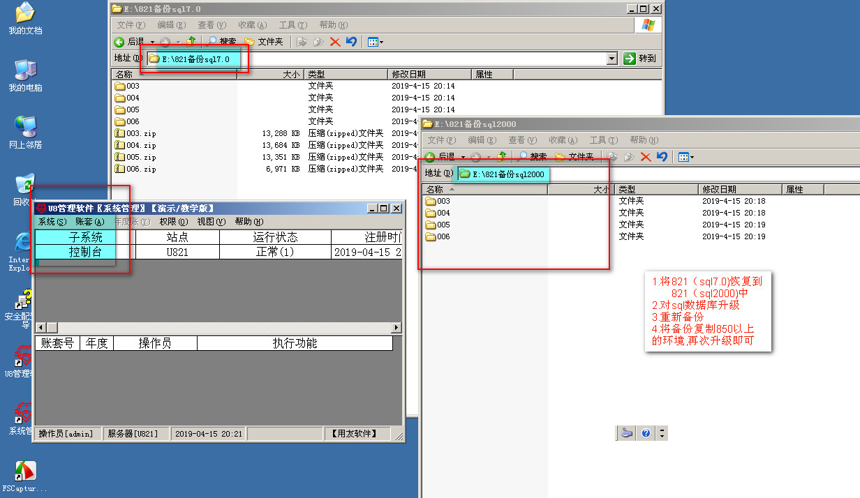 3.将sql7.0/u821的账套还原到sql2000/u821的环境