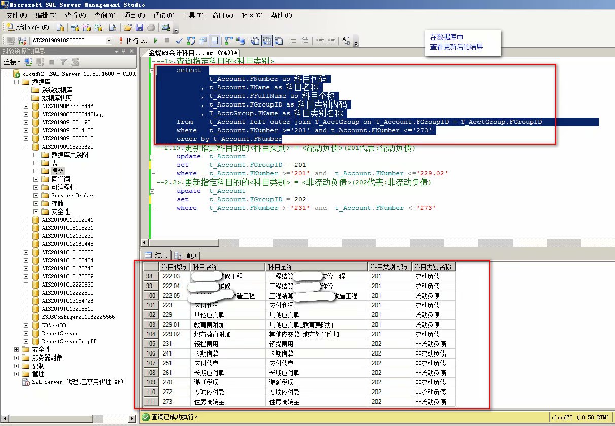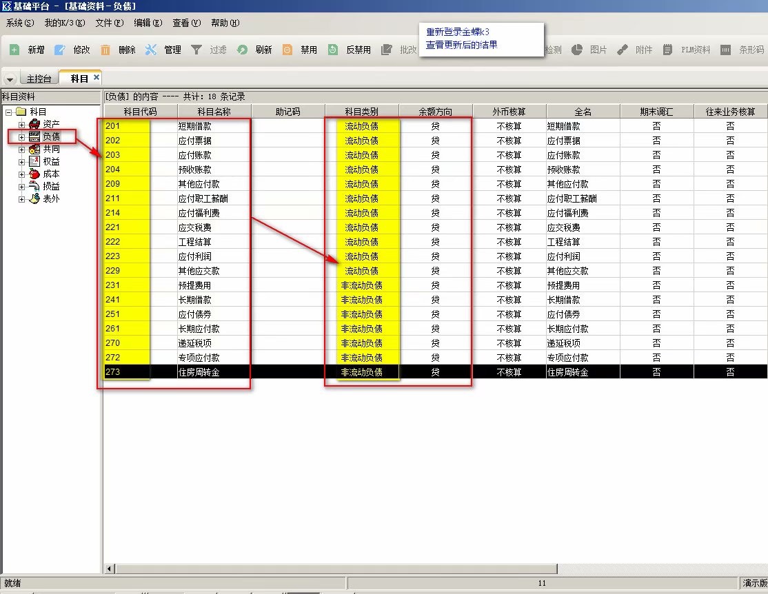 --2.1.1--举例1:>.更新指定科目的的<科目类别> = <流动负债>(201代表:流动负债)