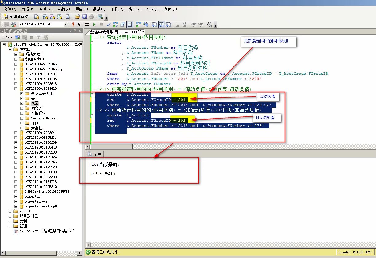 --比如:将<某些科目>---<科目类别>--更新为<流动负债>和<非流动负债>