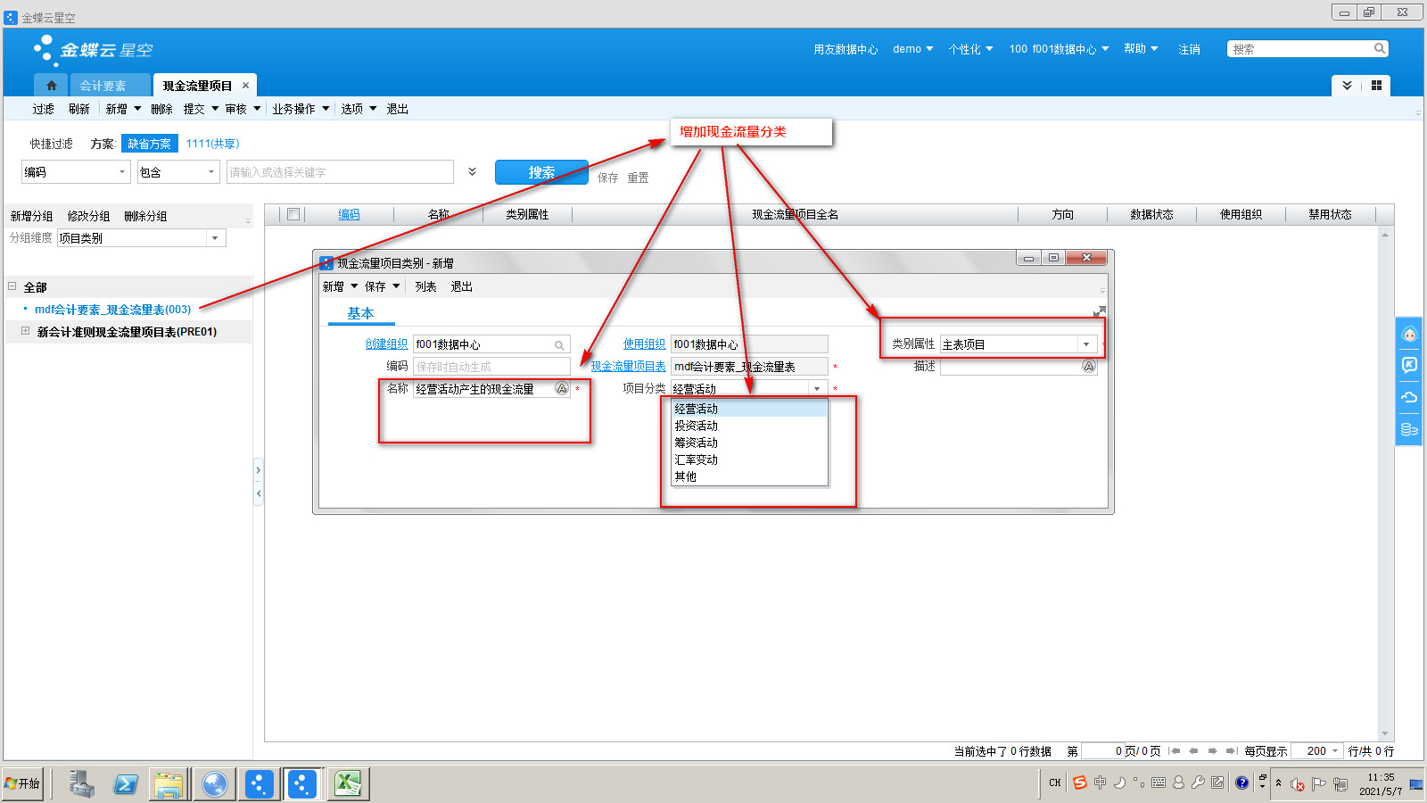 003-1增加现金流量分类1---增加一级现金流量分类,比如:经营活动,投资活动,筹资活动,附表项目等